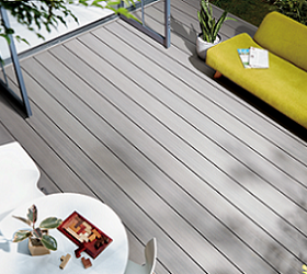 木粉を配合し、温もりのある木質感を再現した人工木ウッドデッキ。ワイド床板を採用し、広々としたデッキライフを演出。
