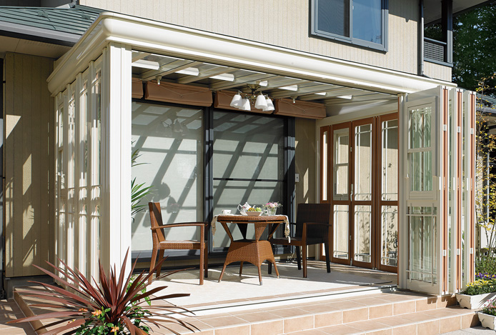 光と風を効率よく取り込み、開放感のあるガーデンテラス「スマーレ」。セミクローズやオープン等、ライフスタイルに応じて演出できます。