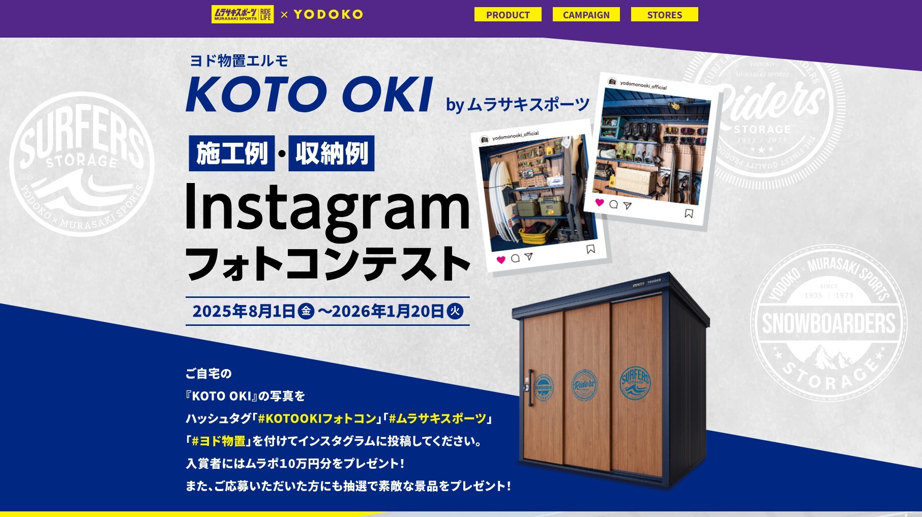 そして発売記念としてお客様の施工例・収納例をインスタグラムにあげて頂くコンテストを実施しています。なんと、受賞者には10万円分のムラサキスポーツポイントが進呈されます。是非ともこの機会に物置を買ってインスタに投稿し、ムラポをもらって新しいギアを手に入れましょう!